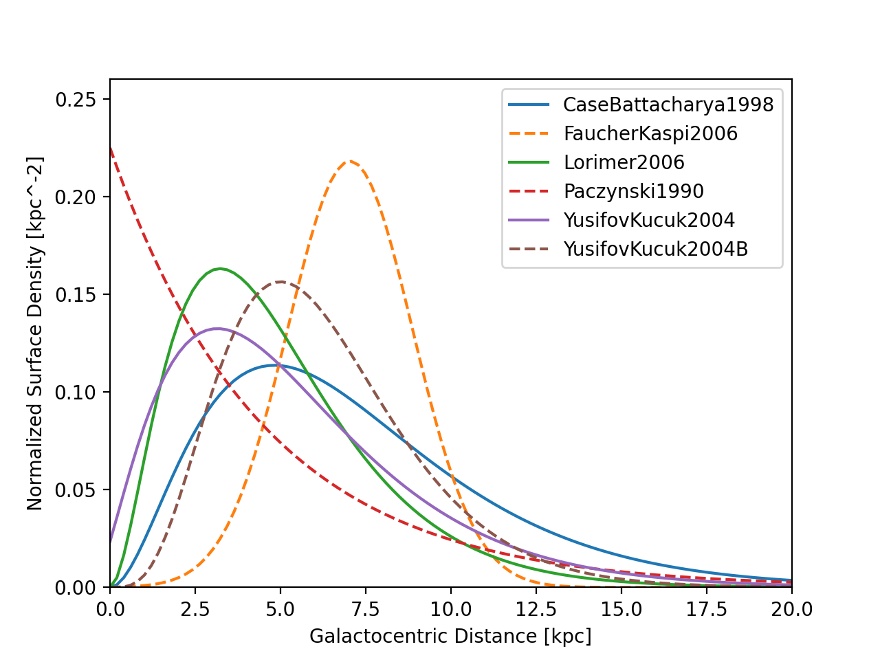 Here is a comparison plot of all available radial distribution functions of the surface density of pulsars and related objects used in literature: